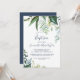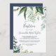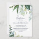 Esta invitación veraniega al bautismo es perfecta para una elegante dedicación al bebé de verano. El diseño botánico presenta un diseño exuberante con eucalipto de acuarela pintada, vegetación y hojas verdes.