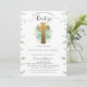 Elegante invitación al bautismo en español con una exquisita cruz dorada rodeada de hojas de acuarela pintadas a mano en tonos verde claro y azul menta. El mismo diseño también está disponible en inglés. Detalles modernos de la tipografía de escritura a mano. Hermosa carta en tonos verde claro de menta con hojas decorativas en los lados y magnífico ramo de follaje central con el nombre de su hija/hijo. El color de la tarjeta trasera se puede cambiar seleccionando personalizar. Invitación con sección para detalles de "Ceremonia" y "Recepción". El estilo unisexo es genial tanto para chicas como para niños. Diseño con variedad de plátanos, palmeras, hojas de helecho. Parte de nuestra colección de eventos religiosos de unisex Elegant Greenery con una variedad de productos de coordinación.