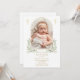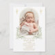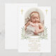 Una elegante invitación de bautismo para que la personalices con una foto especial y detalles en letras doradas elegantes en este diseño moderno con un arco dorado y follaje verde acuarela. Diseñado por Thisisnotme©