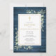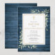 Destacando delicadas hojas de vegetación en acuarela sobre un fondo de madera rústica azul y un elegante crucifijo dorado, esta invitación de bautizo o presentación puede personalizarse con su información especial. Diseñada por Thisisnotme©