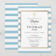 Sencilla invitación de bautizo de raya azul bebé, con una cruz dorada con un borde de lámina dorada falsa elegante que enmarca tus detalles en tipografía moderna. Diseñado por Thisisnotme©