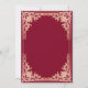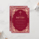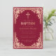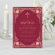 Esta elegante invitación de bautizo en color burgundy y rosa / dorado rosa con aire vintage, recomendada para niña, tiene un marco ornamentado (falso) dorado rosa con elegantes decoraciones barrocas rosadas sobre fondo burgundy. Sobre el texto hay una cruz religiosa dorada rosa. Excepto la ocasión "Bautizo", que también está en dorado rosa, todo el texto se puede personalizar y tiene un color rosa similar al marco dorado rosa.