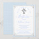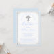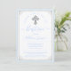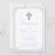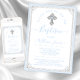 Elegantes invitaciones de bautizo azules y plateadas para bebé con hermosa cruz plateada sobre un fondo de lunares azules y borde plateado. Esta invitación de bautizo de niño se personaliza fácilmente para su evento agregando sus detalles. Puede eliminar la perla azul de la cruz si lo prefiere.