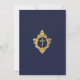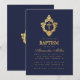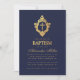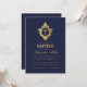 Esta elegante invitación de bautizo en azul marino y dorado con aire vintage, recomendada para el bautizo de un niño, tiene un blasón floral vintage en hojalata dorada, que tiene una cruz en su interior, también en hojalata dorada. El nombre del niño está escrito en una elegante letra caligráfica. Todo el texto se puede personalizar y tiene un color dorado similar al blasón de hojalata dorada. El fondo es azul marino.