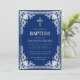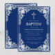 Invitación Bautizo de Niño Elegante Cruz Falsa Azul Real Plat