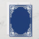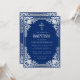 Esta elegante invitación de bautizo azul y plateada con aire vintage, recomendada para niño, tiene un marco ornamentado de falso foil plateado con elegantes decoraciones barrocas gris plateado sobre un fondo azul real. Sobre el texto hay una cruz religiosa en falso foil plateado. Excepto la ocasión "Bautismo", que también está en falso plateado, todo el texto se puede personalizar y tiene un color gris plateado similar al marco de falso plateado.