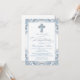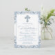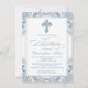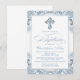 Invitación de bautizo azul para niño con hermosa cruz de diamante azul y elegante escritura sobre un bonito fondo azul bebé y blanco con remolinos. Esta elegante invitación de bautizo azul se personaliza fácilmente para su evento simplemente agregando sus datos en el estilo de letra y color, y redacción de su elección.