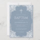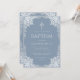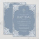 Esta elegante invitación de bautizo de color azul polvoriento con aire vintage, recomendada para niño, tiene un marco ornamentado de lámina plateada falsa con hojas gris plateado sobre un fondo azul polvoriento. Sobre el texto hay una cruz religiosa en lámina de plata falsa. Todo el texto se puede personalizar y tiene un color gris similar al marco de plata falsa.