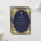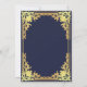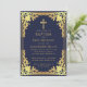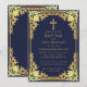 Esta elegante invitación de bautizo en azul marino y dorado con aire vintage, recomendada para un niño, tiene un marco dorado ornamentado con decoraciones de lámina de oro barroco elegante sobre un fondo azul marino. Sobre el texto hay una cruz religiosa en lámina de oro. Todo el texto se puede personalizar y tiene un color dorado similar al marco de lámina de plata.