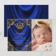 Invitación de bautizo de príncipe con corona azul real y dorada sobre un hermoso fondo de satén azul real y dorado con remolinos. Esta elegante invitación de bautizo de príncipe con corona azul real y dorada se personaliza fácilmente para su evento agregando su foto y detalles del evento, estilo de fuente, tamaño y color de la fuente, y redacción.