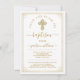 Invitaciones de bautizo doradas neutrales en cuanto a género con hermosa cruz dorada y fondo de borde dorado. Esta invitación de bautizo dorada se personaliza fácilmente para su evento agregando sus detalles. También puede cambiar el color del texto y del fondo al color que prefiera. Puede eliminar el fondo de impresión brillante del dorso y agregar el color de su elección a esta hermosa invitación versátil.