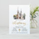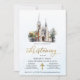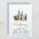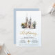 Invitación de Bautizo de acuarela azul polvoriento moderna y elegante. El diseño incluye una ilustración de acuarela de una iglesia, una escritura elegante en dorado para la palabra "Bautizo", una cruz dorada y letras mayúsculas para la información de la celebración. Para cambiar los colores y las fuentes, elija editar este diseño más a fondo para abrir opciones adicionales de personalización.