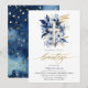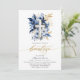 Invitación al bautismo español moderno y elegante. Esta bonita invitación incluye la palabra "Bautizo" en letras de oro escritas a mano. El diseño está decorado con exquisitos acuarelas azul marino y flores doradas, complementadas con una delicada cruz dorada y azul, todo ello con un fondo blanco inmaculado. Personalice la invitación con más detalles de su celebración para crear un mantenimiento verdaderamente único y memorable.