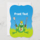 Rana príncipe con herramientas de barbacoa, tongos y espátula sobre hierba verde bajo cielo azul.