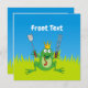 Rana príncipe con herramientas de barbacoa, tongos y espátula sobre hierba verde bajo cielo azul.