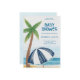 Beach-themed baby shower invitation featuring a palm tree and a striped umbrella on sand with blue ocean waves. Text details event info in blue font.
