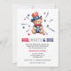 Cuta invitación de Baby Shower de niños con temática del 4 de julio con un oso, estrellas y el texto "rojo, blanco y debido". Personalízalo con los detalles de su fiesta, la información de RSVP y los detalles del Registro. Diseño de fondo en línea con los colores de la bandera de los Estados Unidos.
