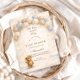 Soft gingham, scattered golden stars, and a scalloped heirloom frame set the sweetest scene for this “We Can Bearly Wait” design. A cuddly teddy bear holding a delicate balloon sits among dreamy clouds, creating a warm and timeless nursery-inspired aesthetic. The gentle blue and beige palette makes it perfect for a baby boy celebration while still feeling soft and classic. Cozy, charming, and effortlessly elegant — a beautiful way to gather loved ones before baby arrives.
