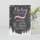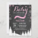 Beba la invitación fría fuera del invierno de Baby Shower. Copo de nieve rosa y blanco.Invitación del Chica Baby Shower. Invitación Baby Shower para vacaciones de invierno. Fondo del tablero. Montaña boscosa.