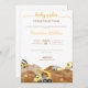 Una invitación a bañarse en una ducha de color agua en cálidos tonos amarillos y marrones, creando un ambiente rústico y acogedor con el tema "bebé en construcción". El amarillo suave forma el color principal, acentuado por ricos elementos marrones que le confieren un aspecto natural. El diseño presenta ilustraciones de acuarela de elementos de construcción, como pequeñas herramientas, bloques de madera y un herbívoro, colocados en el fondo de la tarjeta más que en el fondo. Estos ilustraciones se sientan en la base, agregando un toque lúdico mientras permiten que el texto destaque. La tipografía es divertida pero elegante, haciendo que la invitación sea perfecta para una celebración memorable de la ducha de bebé.