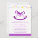 Caballo de mecedora morado pintado a mano con un lienzo gráfico colorido, invitaciones tardías a la ducha de bebé. Ideal si se pierde la ducha de bebé debido a circunstancias imprevistas, incluye un rápido encuentro con el recién nacido y puede ser personalizado con su propia foto de su recién nacido al revés. Hay otros elementos coincidentes disponibles. Original y caprichoso hobby de bebé mecedor de caballos acuarela pintura y diseño gráfico de Sarah Trett para www.mylittleeden.com en Zazzle.