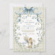 Encantadora ardilla bebé al agua con lazo azul sobre fondo de cuadros verde menta suave, enmarcada por delicadas flores de nomeolvides y corona de hojas. Invitación perfecta de género neutral para un baby shower caprichoso de bosque o cottagecore. Totalmente personalizable: edite texto, colores y más.