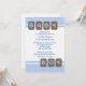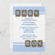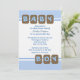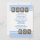 Blue Baby Boy es una tarjeta de invitación para bebés con bordes azules y letras azules bailando extravagantes en cuadrados redondeados marrones, ideal para los niños. © Morning 6
