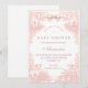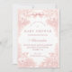 Un diseño de baby shower suave y elegante que presenta delicadas ilustraciones de toile rosa claro estilo vintage. El marco está adornado con corderitos encantadores, florales, acentos celestes y un lazo romántico, creando una estética de guardería de cuento de hadas atemporal. Perfecto para una celebración clásica y femenina con un refinado aire de reliquia familiar. La paleta de rosa suave y el estilo de grabado detallado dan al diseño una atmósfera sofisticada y dulce que funciona maravillosamente para baby showers tradicionales o de estilo cottagecore.