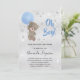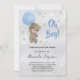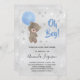 Para una ducha de bebé celebrando a un niño. Un falso fondo metálico plateado. Oso de peluche con estrellas de globo azul y polvo falso purpurina. Personalice y agregue el nombre de la futura madre y los detalles del fiesta. El nombre y el texto: Oh Boy! están escritos con un guión de estilo con letras a mano