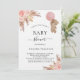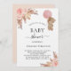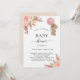 Para una moderna ducha tipo boho. Fondo blanco en el frente. Decorado con rosa de oro y flores rosadas, rosas, pampas y un chica de oso de peluche sosteniendo un globo rosa. Personalice y agregue un nombre y detalles del fiesta. Atrás: Un fondo dorado rosa.