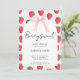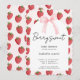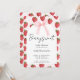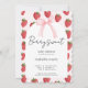 Una dulce bebé está en camino, Invitación de Baby Shower de Fresa con un fondo de patrón de fresas de acuarela rosa y rojo y un marco arqueado de color crema para su información, la tipografía de letra hermosa hace que esta sea una invitación de baby shower linda y moderna para la celebración de la llegada de su niña especial, es el tema perfecto de fresa para un baby shower de primavera o verano. Obtenga impresiones y/o descargue una invitación digital.