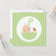Elegantes invitaciones para una ducha de bebé con un ilustracion de bebé lindo y un pájaro en un paraguas sobre un fondo de rayas. Art © Cocoa Studio