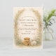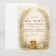 Un encantador diseño campestre que presenta un ternero esponjoso, un corderito dulce y pollitos amarillos diminutos entre suaves flores silvestres de prado. El fondo cálido de pergamino y los tonos terrosos suaves crean una atmósfera acogedora y rústica con un toque de cuento de hadas. Un delicado follaje enmarca la composición mientras que la ilustración de animales de granja añade calidez y personalidad. Perfecto para una celebración neutral con temática rural y encanto clásico de granja.