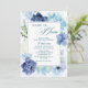 Celebra la próxima llegada de tu pequeño con esta elegante invitación a la ducha con flores de color "Baby in Bloom". Con una suave y acuarela flor blanca y azul de hidraangea y una delicada vegetación, este diseño desprende un encanto botánico y fresco, perfecto para una ducha de bebé en primavera, verano o invierno. Los tranquilizantes tonos azules lo convierten en el lugar ideal para los niños, mientras que las flores acuáticas crean un ambiente atemporal y elegante. Personalizar la invitación con los detalles de tu evento para hacerlo personal y único. Ideal para los que buscan una ducha de diseño inspirada en la naturaleza
