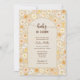 La invitación a Baby in Bloom con flores prensadas presenta un suave marco rústico abovedado con flores silvestres prensadas sobre un fondo de tela muda.