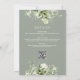 Invitación a una ducha de bebé en flor con código QR de su registro y detalles de la ducha de bebé, ambientada en una elegante tipografía vegetal de bonito sobre un fondo verde sage neutro de género. Diseñado por Thisisnotme©