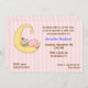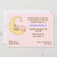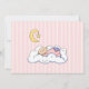 Invitación a la ducha de chispas dulces hecha con un fondo de rayas rosas y blancas. Gráficos cortos de una niña que duerme en una luna creciente, decora la esquina superior izquierda, y una niña que duerme en una nube decora la parte trasera de la invitación. El texto en color marrón y azul perwinkle está listo para personalizar para tu evento de ducha de bebé. Invitar amablemente a la mamá a ser salvará para siempre, con los keepsakes de su recién nacido.