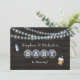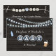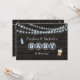 Madera rústica, oscura con luces de cuerda azules en la parte superior, botella azul a la izquierda, taza espumosa de cerveza a la derecha, y tapas de botellas "BABY" azul/blanco. El reverso incluye una cuerda atada con cuentas de niño y un corazón azul. Plantillas creadas para usted, para que pueda hacer su ducha de bebé.