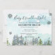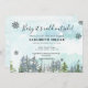 Cuidada tarjeta de invitación a la ducha de bebé de invierno con un paisaje nevado. Un hermoso bosque acuático con pinos hacen de esta tarjeta un complemento especial para su ducha de bebé de invierno.