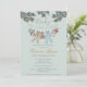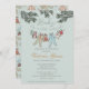 Esta invitación a la ducha para bebés, de raza neutra y de género "Baby it's fría out", Navidades de sexo neutro, presenta un patrón hecho a mano de Navidades con trajes de bebé, adorables animales rellenos de invierno (pingüino, reno, oso de peluche) y bbs colgados en un tendedero y enmarcados en ramas de pinos. En la parte trasera hay trajes de bebé, animales rellenos, biberones, botellas, pacificadores y regalos de navidad, todo ello con un suave fondo verde con bonitas estrellas dispersas. Personaliza con tus detalles pares.