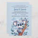 Esta dulce invitación para baby shower de koala bebé se puede utilizar para un bebé niño o niña. Cuenta con un diseño suave y conmovedor, perfecto para celebrar a un nuevo pequeño. En el centro hay un adorable koala con ojos grandes y suaves, mejillas sonrosadas y orejas esponjosas, que sostiene una rama de eucalipto o abraza a un pequeño koala bebé. La paleta de colores es tranquila y calmante, con tonos de gris suave, rosa, verde salvia y azul teñido suave, creando un ambiente cálido y acogedor.