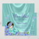 Invitación de baby shower azul cian y champán con hermosas flores cian y champán y adorable bebé de sexo femenino que viste cian y una diadema floral sobre un hermoso fondo de satén lujoso. Puede agregar sus datos en el estilo de letra, color y redacción de su elección. Algunos gráficos artwork©Delightful-Doodles.