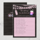 Este es un juego de ducha de bebé de How Well Do You Know the Dad-to-be. Luces de cuerda con una botella de bebé rosa y una taza de cerveza espumosa sobre fondo de madera oscura. Bottlecap "Baby" typography on back, junto con plantillas.