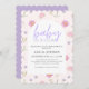 Esta invitación a la ducha de bebé con flores de color rosa y púrpura presenta flores rosadas, violetas y melocotones con fondo rosa rubor con un texto que dice "bebé en flor". Un perfecto tema de ducha de bebé con flores rosadas.
