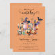 "Únete a nosotros para una festividad de Halloween con nuestra invitación "Bebe, brujas!". Con una plantilla moderna que es fácil de personalizar, esta invitación está adornada con imágenes de acuarela de cócteles espeluznantes, tiros, gorras de brujas, murciélagos, calabazas, cráneos y velas. Es la manera perfecta de reunir a tus novias para pasarla muy bien esta Halloween."