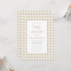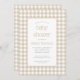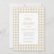 Esta invitación a la ducha para bebés tiene un fondo rústico de color beige y gingham blanco. El texto aparece en un rectángulo blanco con un delgado borde beige y esquinas redondeadas, con las palabras "baby ducha" y el nombre de la futura madre en una tipografía beige encantadora y el texto restante en letras grises sans serif. Ideal para una ducha para niños o chicas. El patrón de gingham se repite en la parte posterior de la tarjeta.