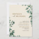 Invitaciones de boda de estilo simplista con un diseño moderno fuera de centro y un marco botánico. Eucalipto azul-verde oscuro sobre un fondo de marfil. Diseño casual ideal para bodas pequeños o cualquier boda de temática minimalista.