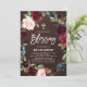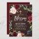 Invitar a un invitado con esta invitación floral a bendecir a un bebé de este país. Cuenta con ilustraciones acuáticos de flores de color burdeos, ruidosas y azules sobre un fondo falso de madera oscura. Esta invitación borgoñona floral es perfecta para las bendiciones temáticas del otoño y del boho. Personalice agregando sus propios detalles.