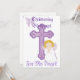 Bendiciones del Bautizo de Mi Ángel. Una Transformación Espiritual Celestial. Cruz morada de Jesús guiando la santidad de la ocasión. Una mariposa morada simbolizando la transformación del alma. Personalice para una entrada dorada a este evento especial. Personalizar.