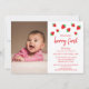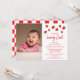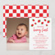 Cerezo dulce de fresa 1ª invitación de cumpleaños con fruta roja y telón de fondo estilo tablero de ajedrez. Plantilla de foto vía Pixabay bajo licencia CC0 y debe ser reemplazada por su propia foto